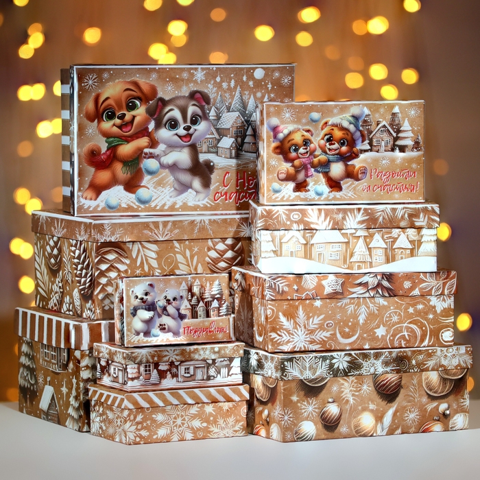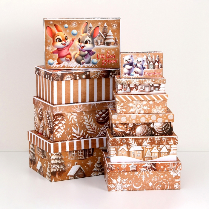 Набор подарочных новогодних коробок 10 в 1 "Зверята", 32,5 х 20 х 12,5 - 12 х 7 х 4 см. Новый год