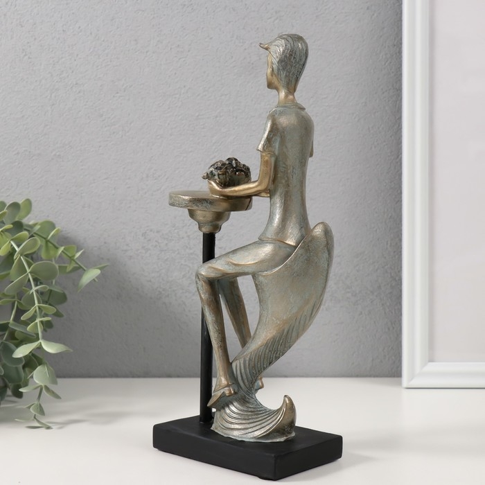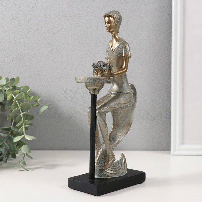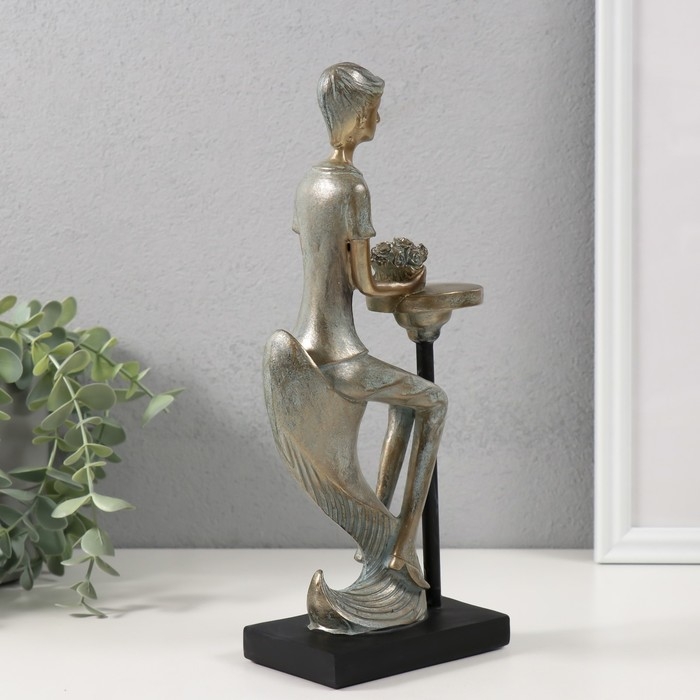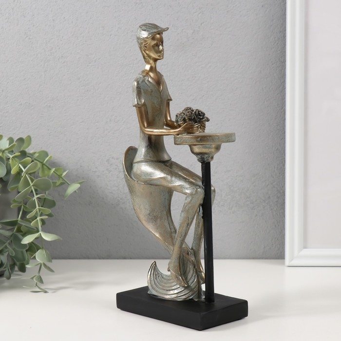 Сувенир полистоун "Парень с букетом в ожидании девушки" бронза с патиной 11,5х6х26 см