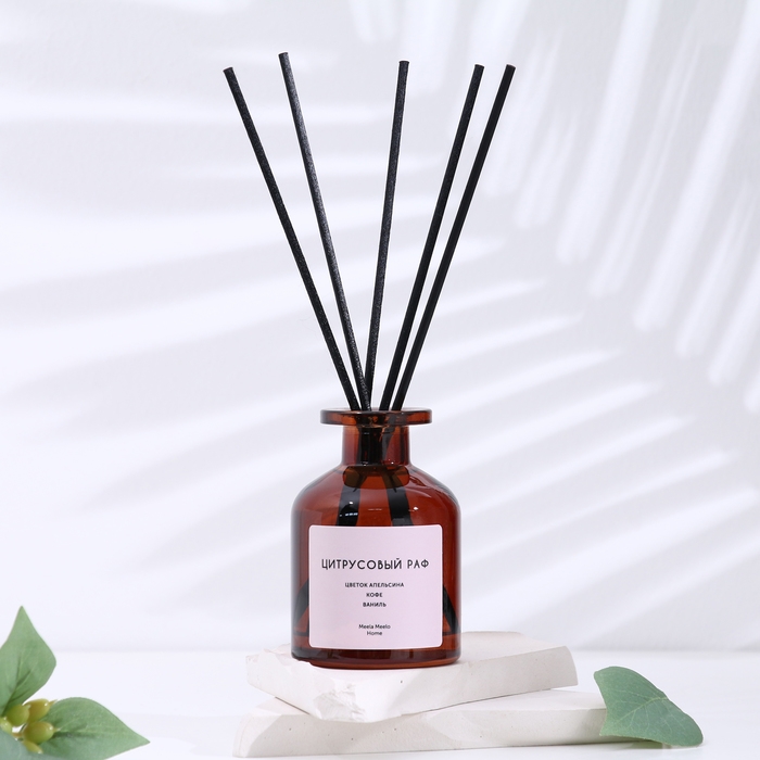 Диффузор «ЦИТРУСОВЫЙ РАФ» поставляется в стильной колбе из тёмного стекла, которая не только выглядит элегантно, но и защищает содержимое от воздействия света. Качественная упаковка из гофрированного картона с подложкой обеспечивает безопасную доставку и подчёркивает уникальный стиль декора.
