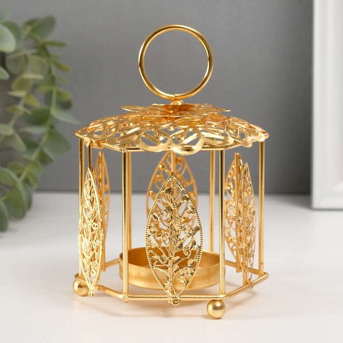 Подсвечник металл на 1 свечу "Фонарик. Цветок и листья" золото d=5,5 см 9,8х10,5х14 см