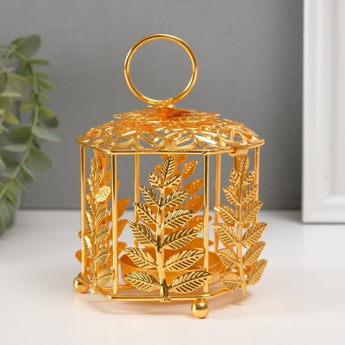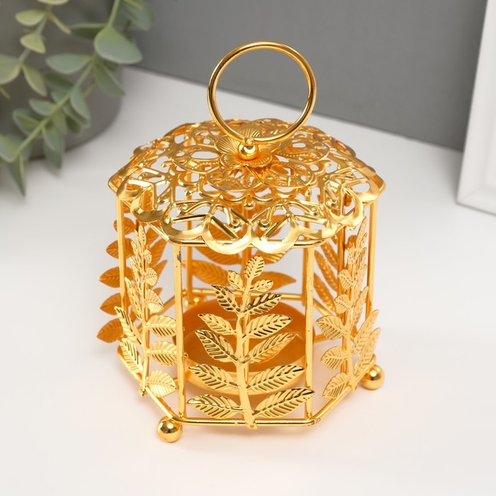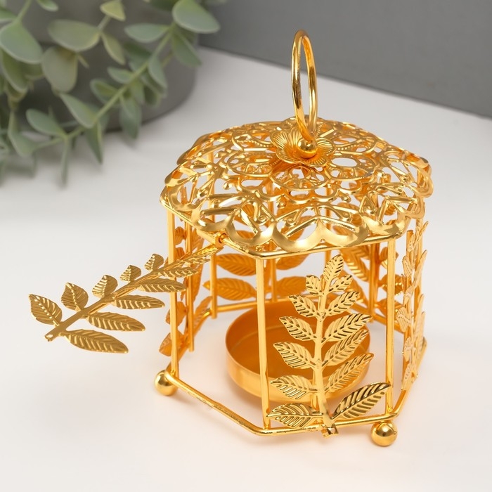 Подсвечник металл на 1 свечу "Фонарик. Цветок и веточки" золото d=5,5 см 9,8х10,5х14 см