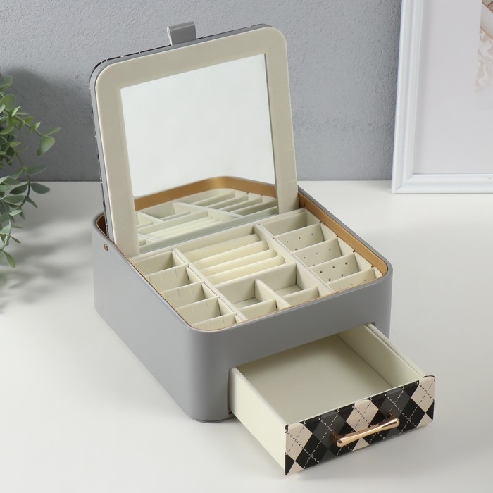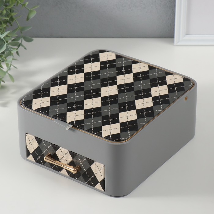 Шкатулка кожзам для украшений "Клетка" серая 20х22,5х9,5 см