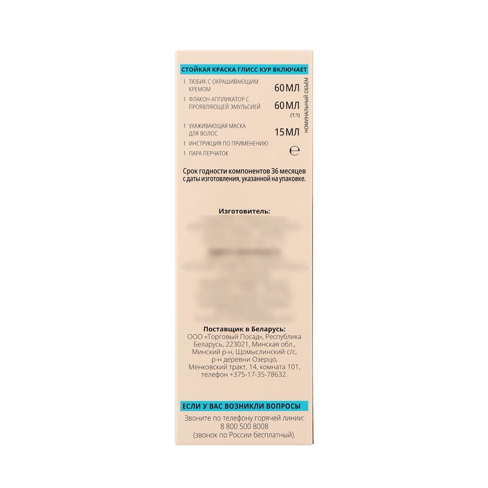 - Проявляющая эмульсия: Aqua (Water, Eau), Hydrogen Peroxide, Cetearyl Alcohol, Propylene Glycol, Ceteareth-20, Steartrimonium Chloride, Paraffinum Liquidum (Mineral Oil, Huile Minérale), Etidronic Acid, 2,6-Dicarboxypyridine, Disodium Pyrophosphate, Potassium Hydroxide, Isopropyl Alcohol, Sodium Benzoate
