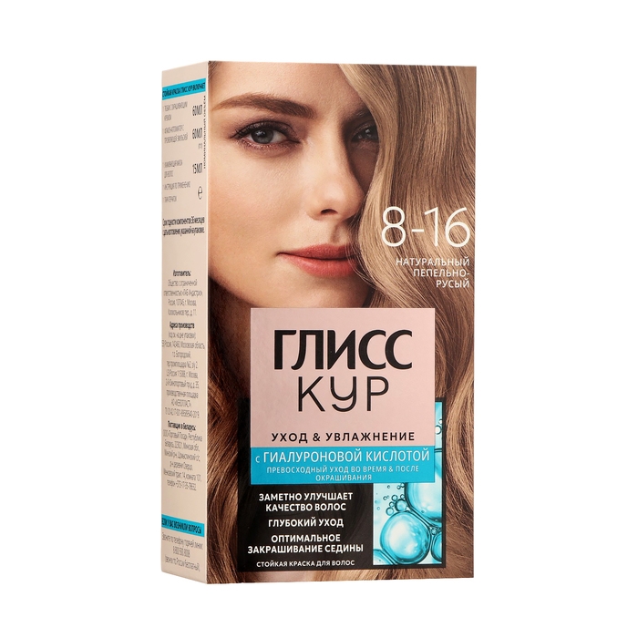 Стойкая краска для волос глисс кур уход и увлажнение с гиалуроновой кислотой и защитой от повреждений 8-16 Натуральный пепельно-русый.