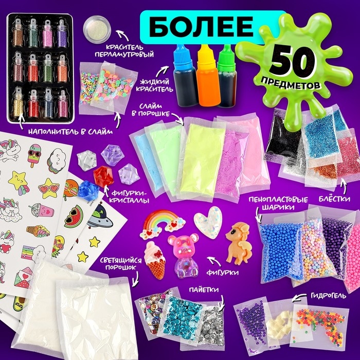 - В комплекте есть всё необходимое для опытов: глиттеры, шарики, фигурки и красители, что делает процесс создания слаймов более увлекательным.