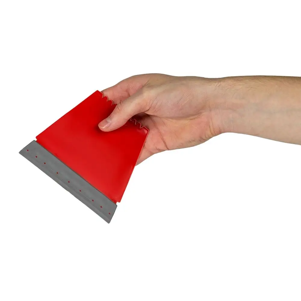 Все 4 стороны скребка рабочие: резиновый водосгон с широкой стороны, зубья-ледорубы с узкой и две скошенные грани по бокам.