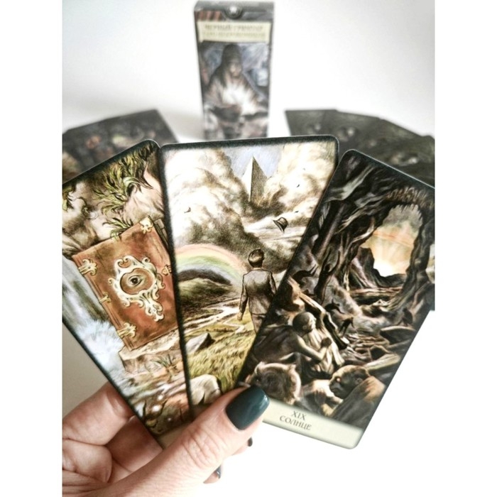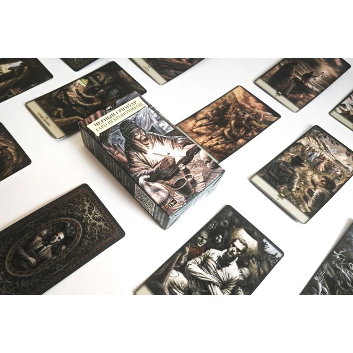 Гримуа́р, или гримория — средневековая книга, в которой, как считалось, описываются магические процедуры и заклинания для вызова духов или содержащая какие-либо колдовские заклинания. Таинственное Таро Черных гримуаров берет свое название из этой книги и представляет собой захватывающие и тревожные видения темной стороны человеческой психики. Колода приглашает вас в путешествие в мир подсознания, где за мрачной неизвестностью и леденящим ужасом самых темных уголков души и разума, вы получаете ответы и находите источники своих страхов и сомнений. В колоде представлены 78 карт с инструкциями на русском языке.
