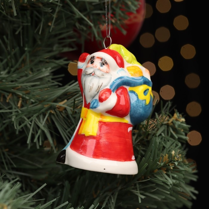 Ёлочная фарфоровая игрушка "Дед Мороз, мешок с подарками", красная шуба, 8 см