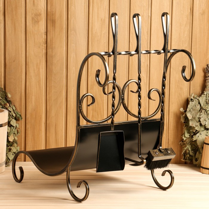 Каминный набор КН-6-4 кованый с дровницей, цвет бронза, 3 предмета: кочерга, совок, метёлка