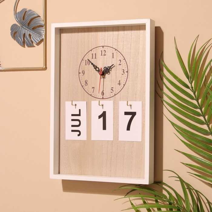 Сувенир вечный календарь подвесной с часами, дерево, 2х20х30 см, цв. белый