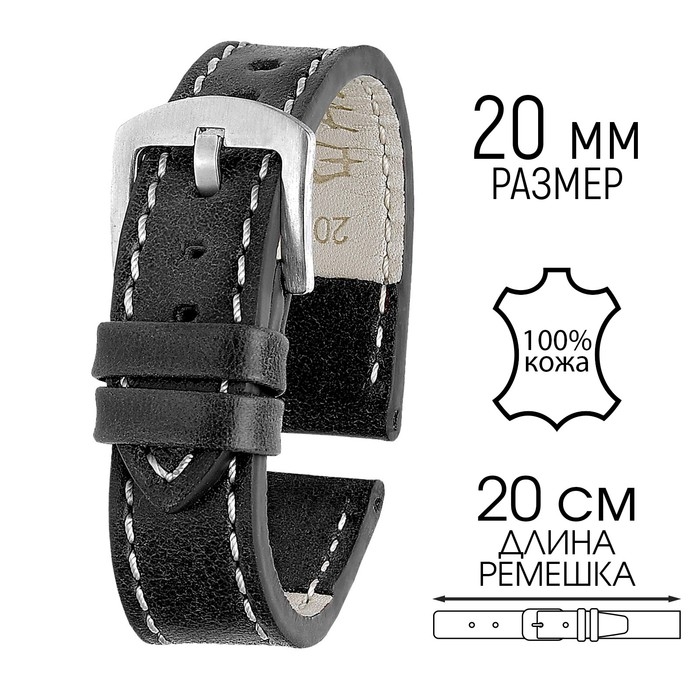 Ремешок для часов, 20 мм, запряжник 80 мм, горт 120 мм, натуральная кожа, черный