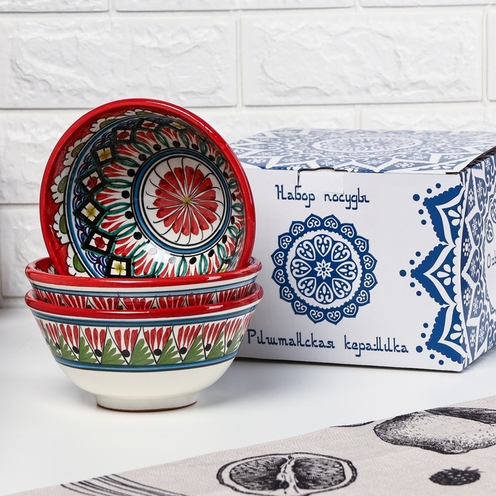 Набор салатников Риштанская керамика "Узоры", 15 см, 3 шт, в подарочной упаковке, красные