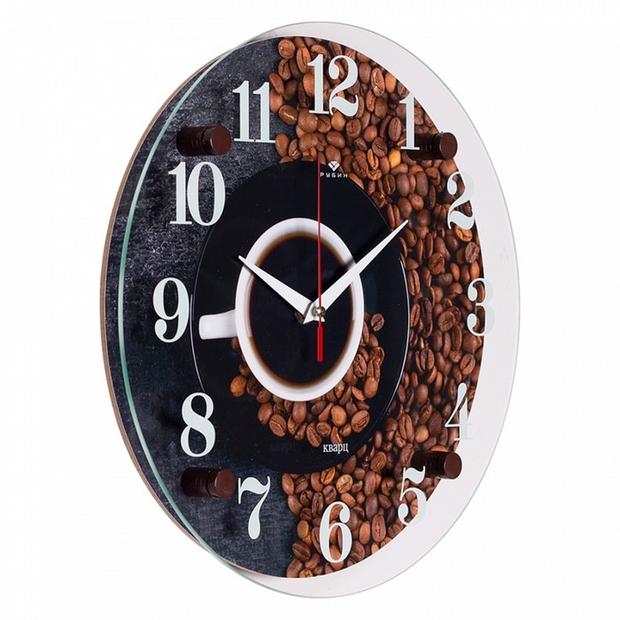 Изображение кофейных зёрен и хорошо читаемые арабские цифры делают эти часы ярким дополнением для интерьера вашей кухни. Они прекрасно сочетаются с любым стилем. Часы с таким дизайном придутся по душе любому кофеману.