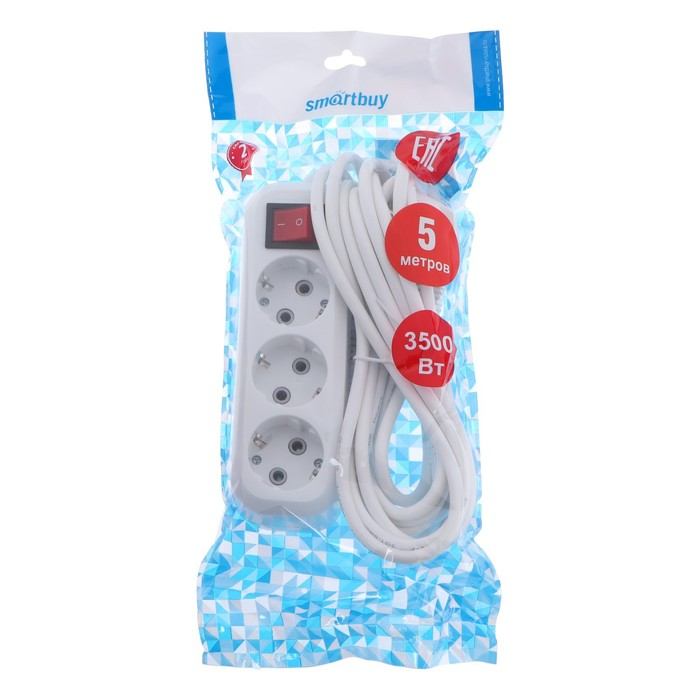 Удлинитель Smartbuy, 3 розетки, 5м, 16 А, 3500 Вт, ПВС 3х1 мм2, с з/к, с выкл., белый