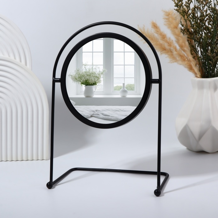 Подставка зеркала обеспечит надежную устойчивость, позволяя удобно использовать его для нанесения макияжа, причесок или просто для визуального контроля своего внешнего вида. Размер зеркала позволяет увидеть не только лицо, но и частично верхнюю часть тела, что особенно удобно при укладке волос или использовании аксессуаров.