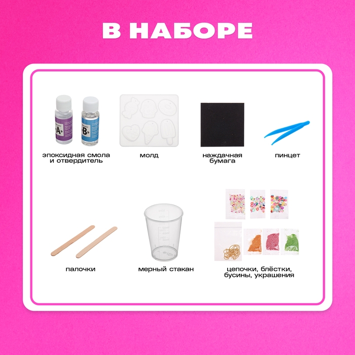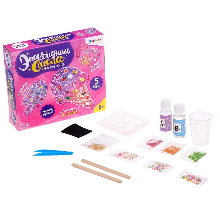 Набор для опытов «Эпоксидная смола» — идеальное решение для занятия творчеством! Ребёнок проведёт увлекательный эксперимент и создаст уникальные украшения из эпоксидной смолы!