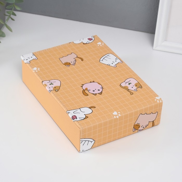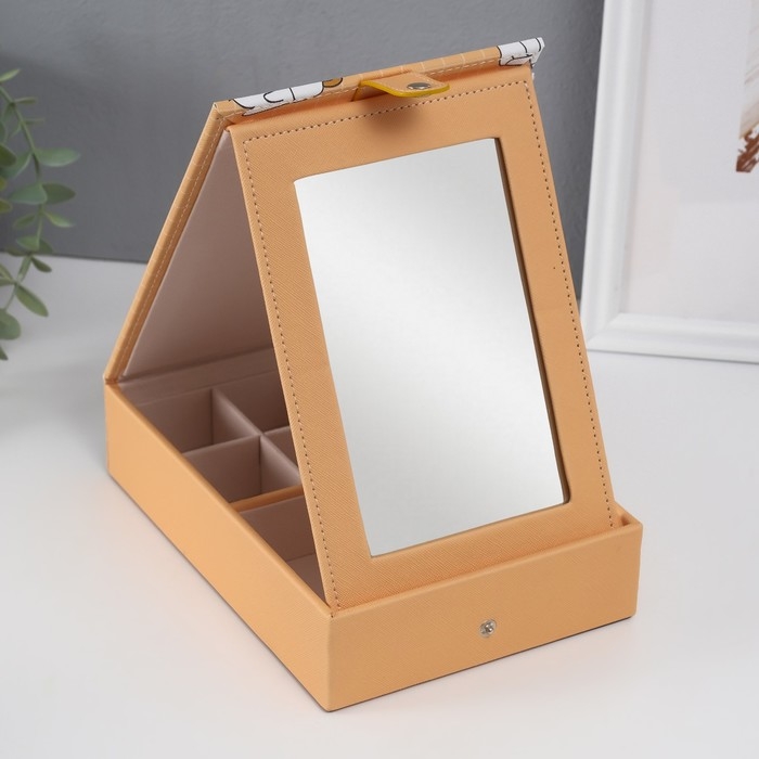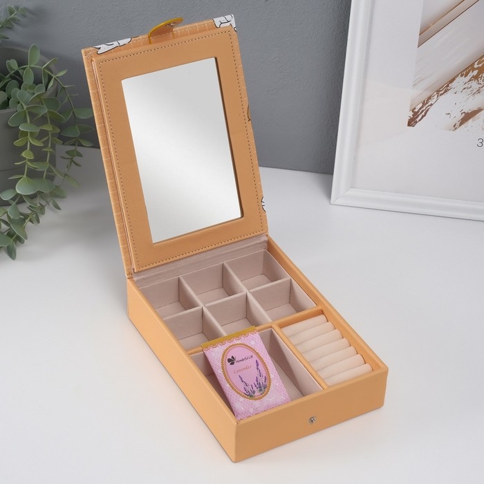 Шкатулка кожзам для украшений с зеркалом "Котики" жёлтая 15х21,5х5,5 см