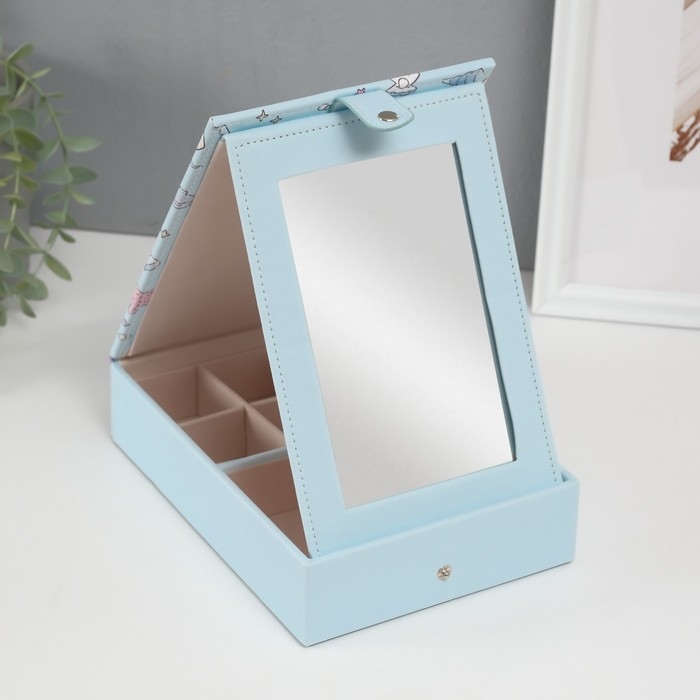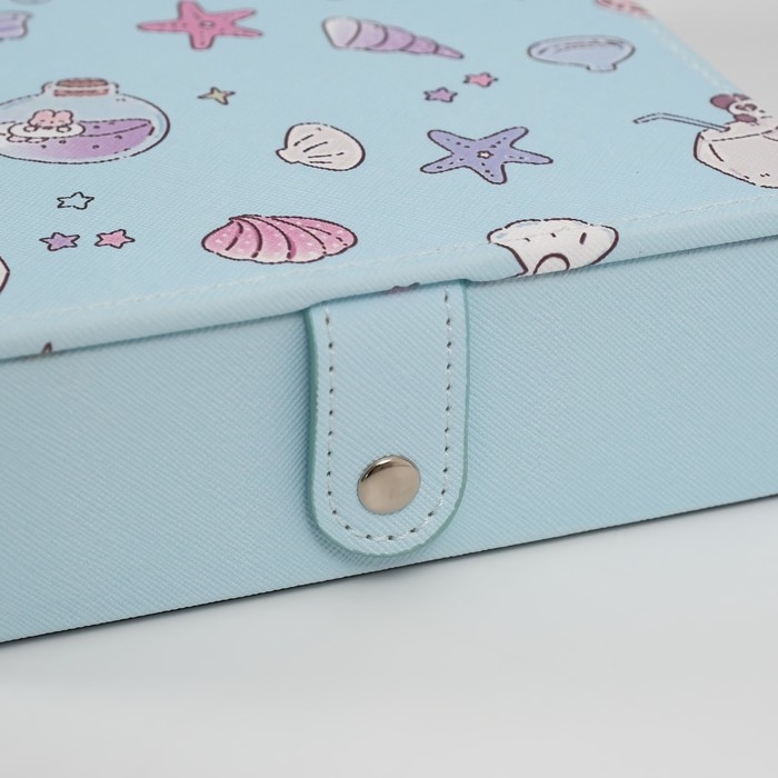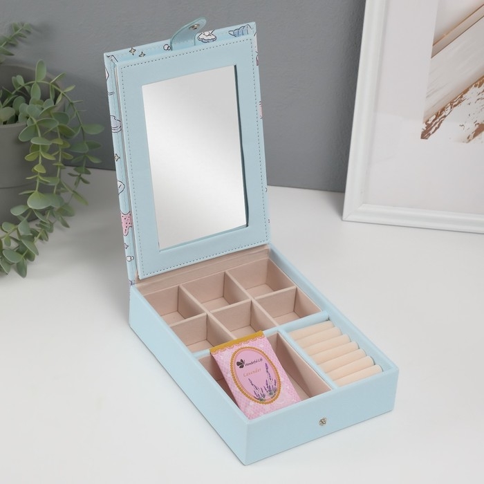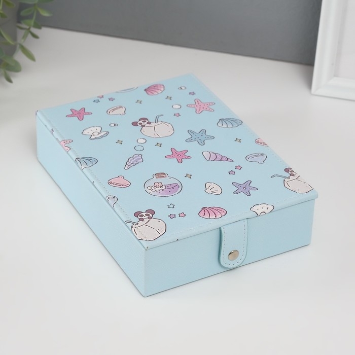 Шкатулка кожзам для украшений с зеркалом "Панда и ракушки" голубая 15х21,5х5,5 см
