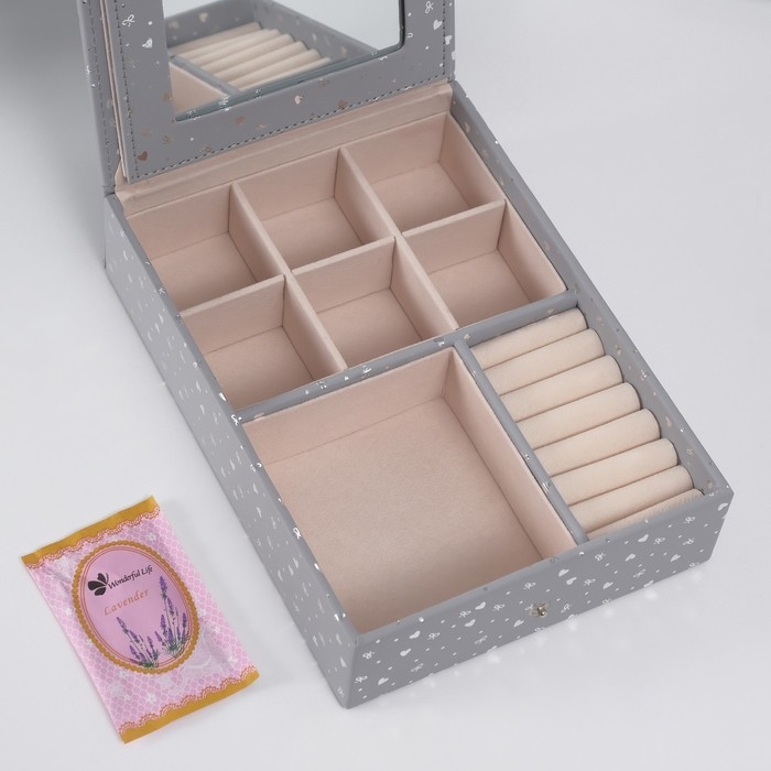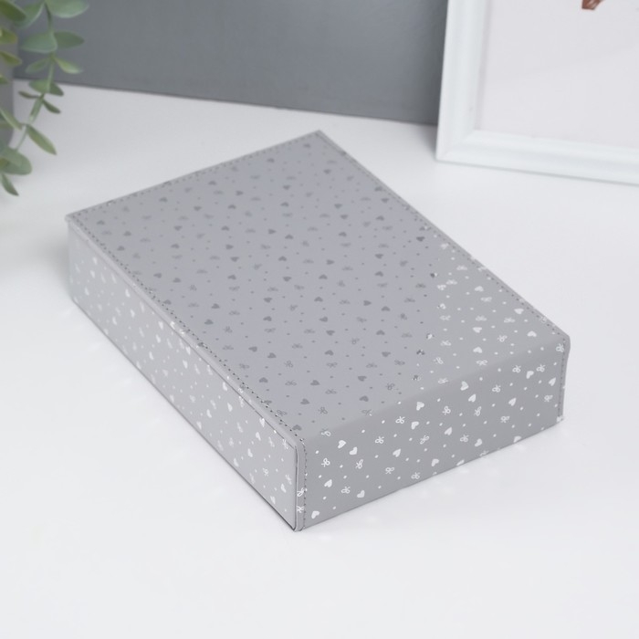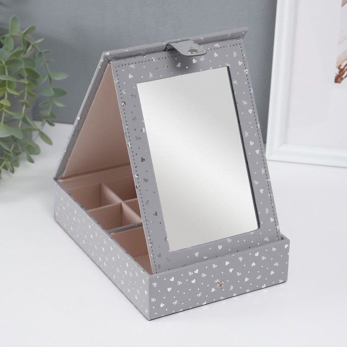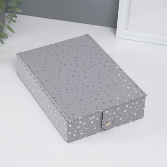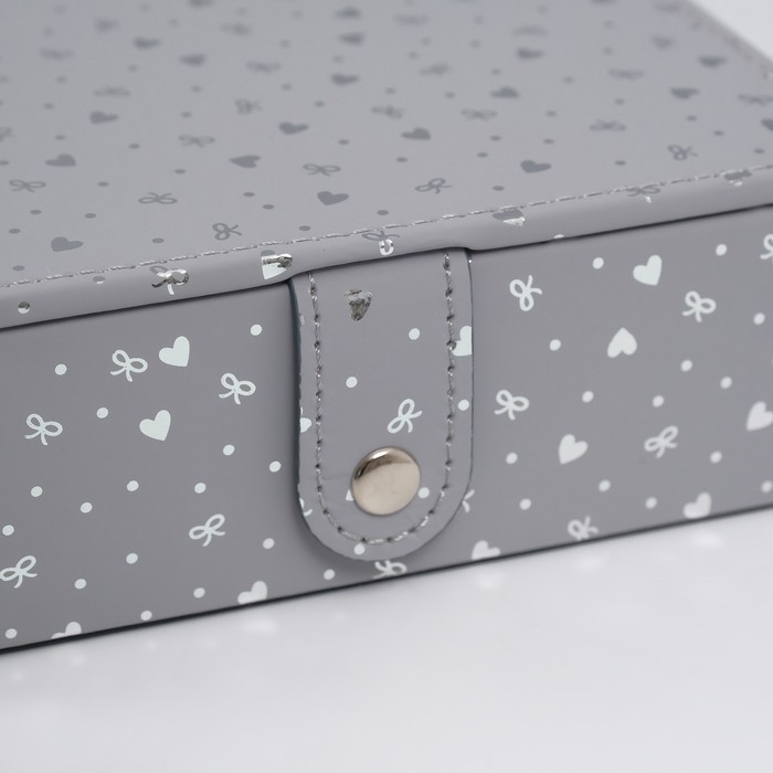 Шкатулка кожзам для украшений с зеркалом "Сердечки" серая матовая тиснение 15х21,5х5,5 см