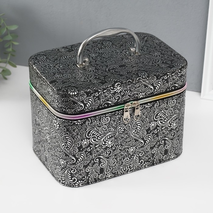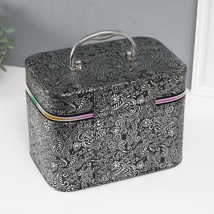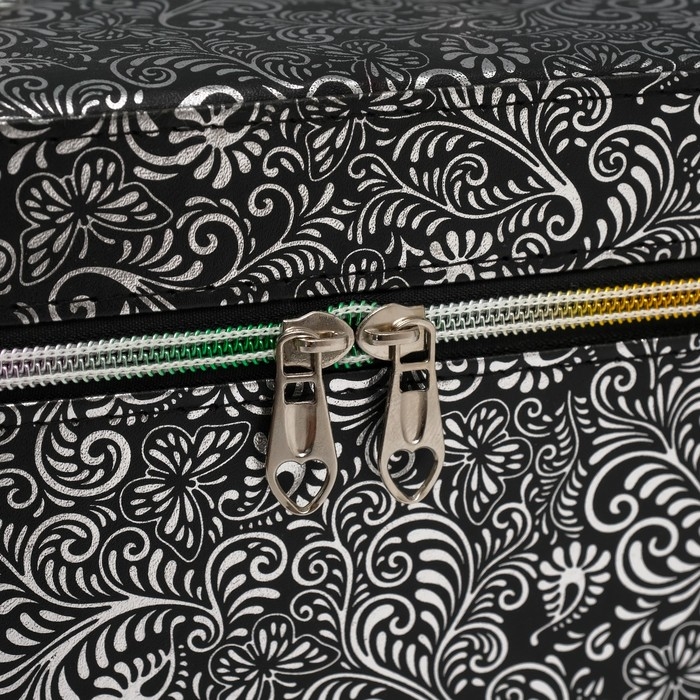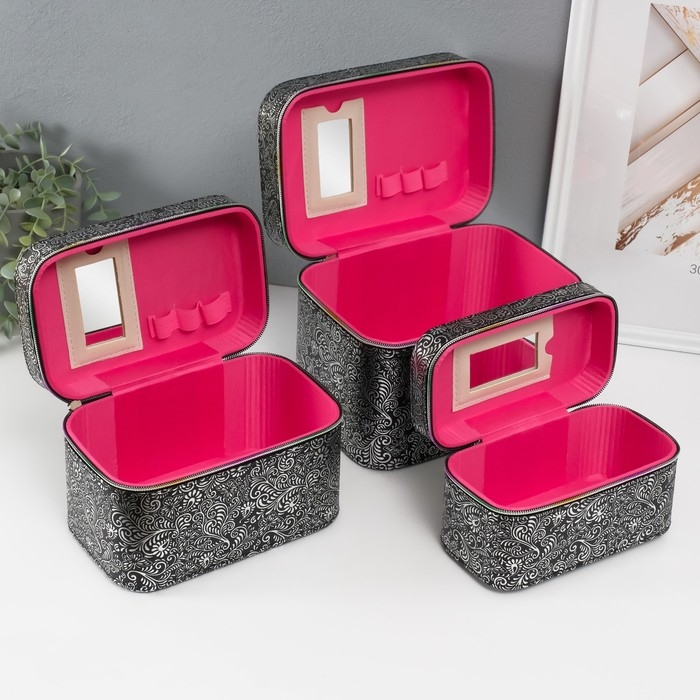 Шкатулка кожзам с зеркалом "Узоры, бабочки" чёрная н-р 3 шт 19х10,5х10,5 21х13х14 15х23х17см