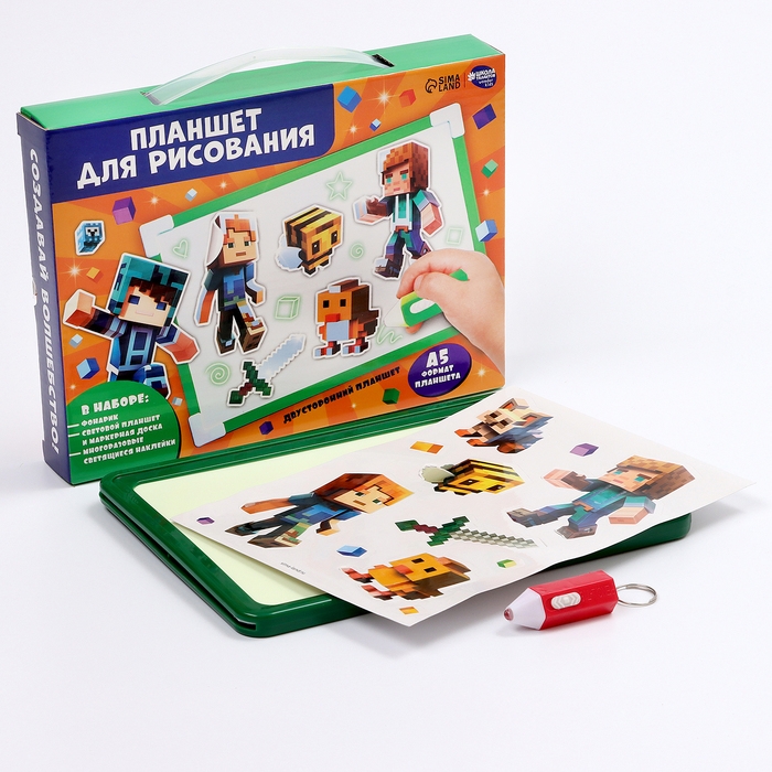 С помощью такой доски кроха сможет опробовать рисование светом. Для этого поместите планшет в тёмное место, удерживайте кнопку на маркере и ведите по поверхности. Ребёнок может использовать трафарет или придумать собственные сюжеты. Чем ближе вы держите маркер к планшету, тем ярче будет изображение.