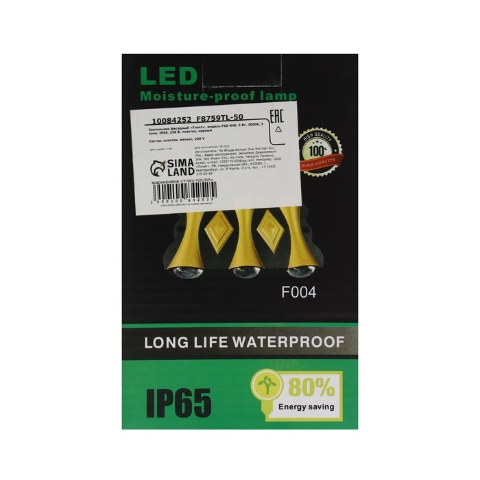 Светильник фасадный «Глосс», FSD-045, 6 Вт, 3000К, 3 луча, IP65, 220 В, пластик, черный