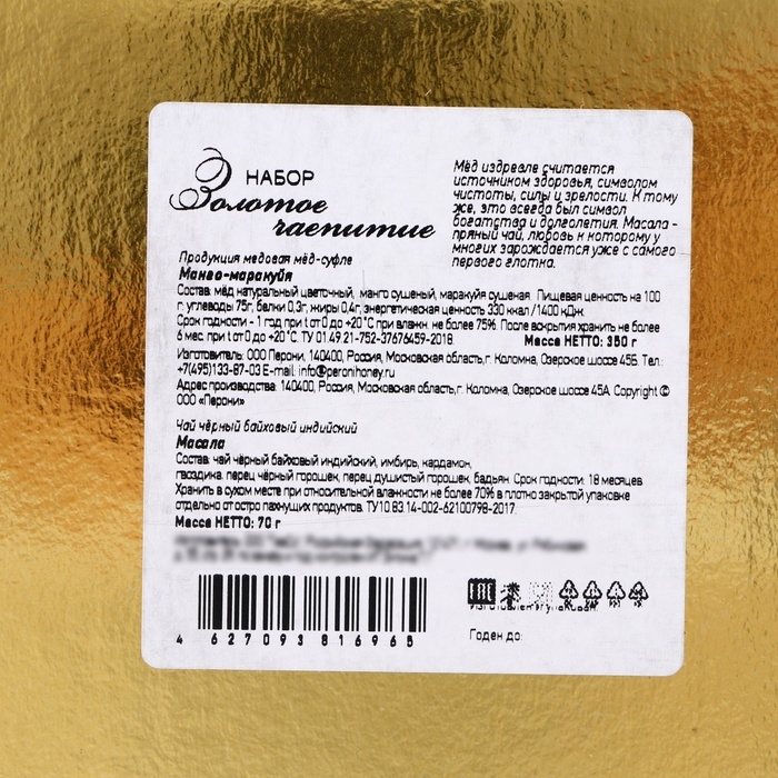 Подарочная упаковка "Золотое чаепитие" оформлена в стильном и элегантном дизайне, подчеркивающем атмосферу праздника и роскоши. В этот набор вложены не только высококачественные продукты, но и тёплое внимание, которое превратит каждое чаепитие в незабываемое событие. Подарите себе и своим близким возможность насладиться волшебством зимнего чая с медом, и пусть каждый момент будет наполнен сладкими воспоминаниями и уютом в этом праздничном сезоне.