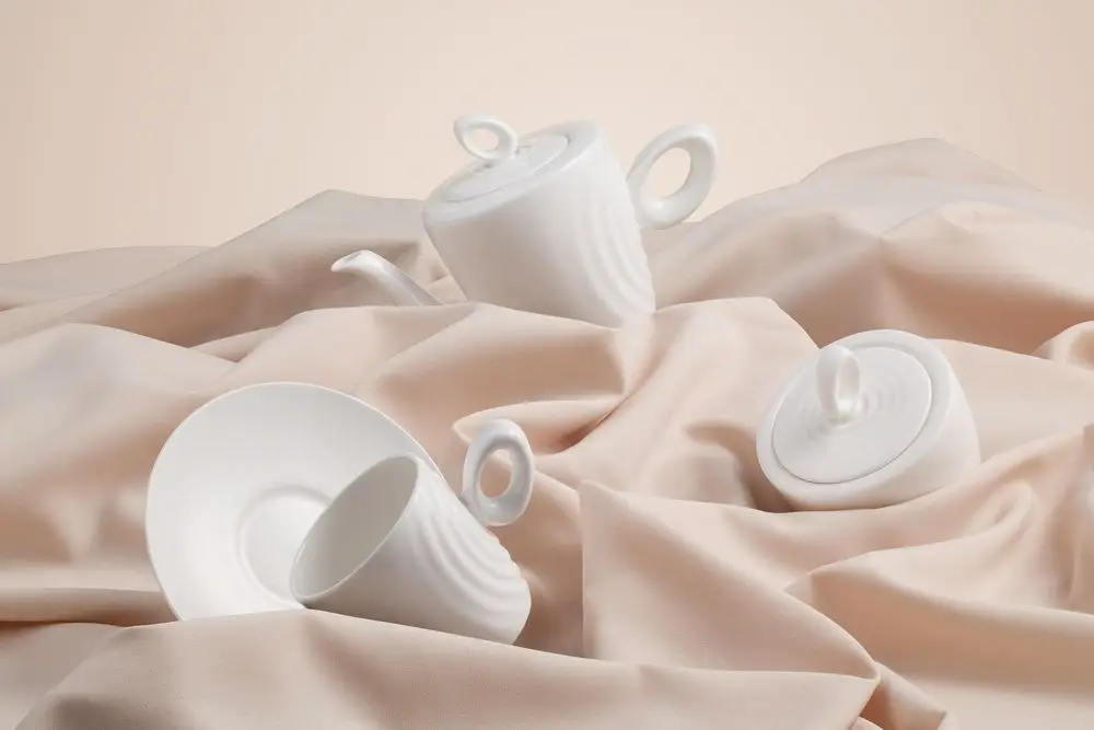 Посуда выполнена из костяного фарфора, что делает ее необычайно легкой и прочной одновременно. При этом благодаря биоморфическим формам кажется, что твердый материал становится мягким и податливым.