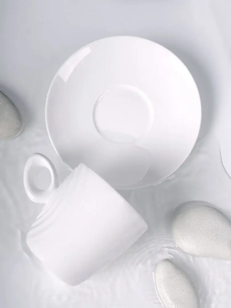 Форма сервиза создана в скульптурной технике: фарфор словно запечатлел сам момент движения. Необычная ручка предметов символизирует камень, от которого появляются завораживающие круги на воде — корпусе изделия.