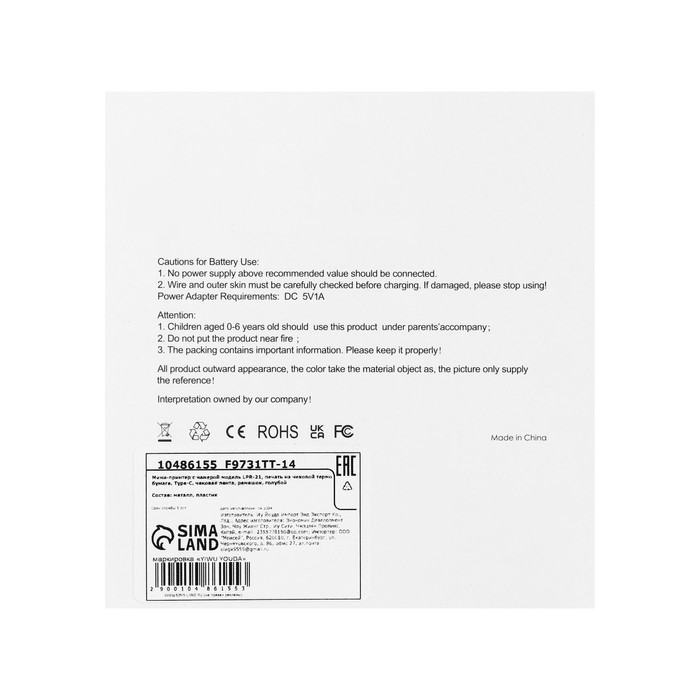 Мини-принтер с камерой LPR-21, Туре-С, лента, ремешок, голубой