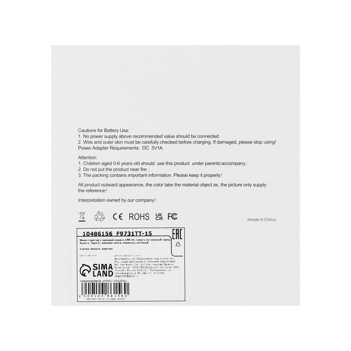Портативный термопринтер LPR-04, для печати док., стикеров, наклеек, бумага в компл, белый