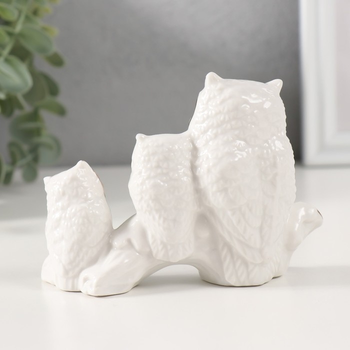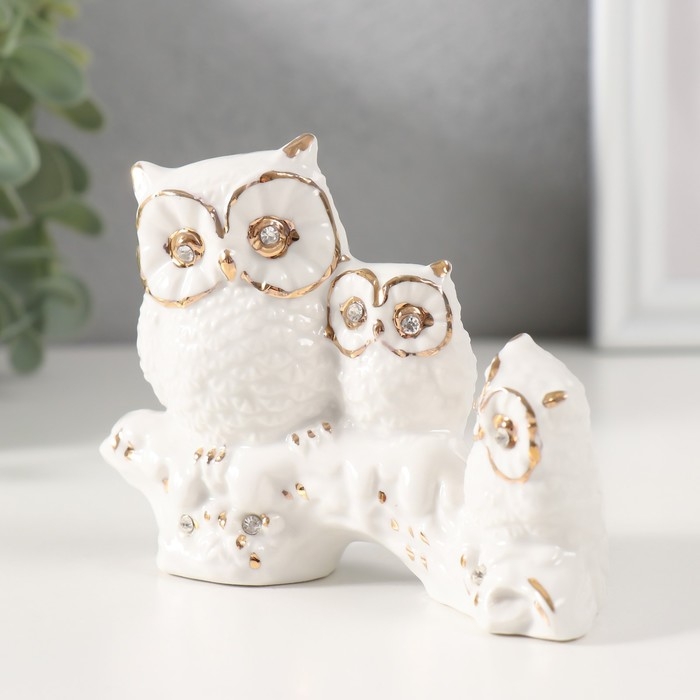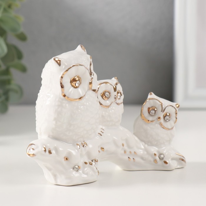 Сувенир керамика "Три белых филина на коряге" с золотом, стразы 3,8х11х8,5 см