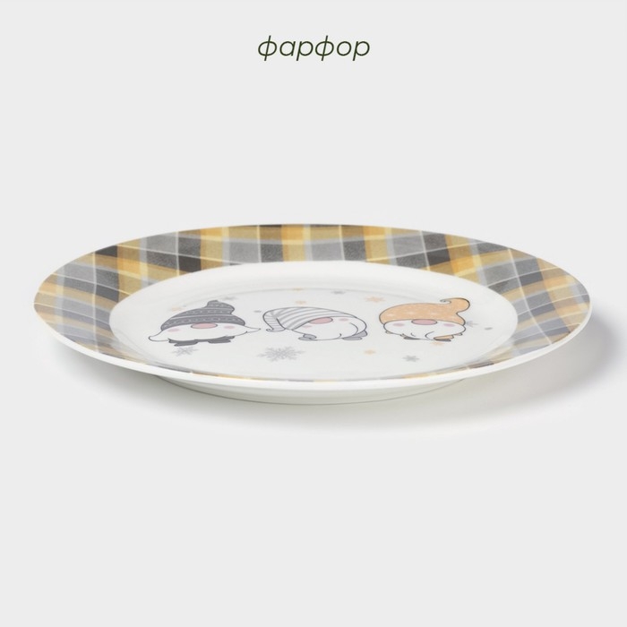 Тарелка новогодняя Доляна «Домашние гномики», d=20,5 см, фарфор, цвет белый
