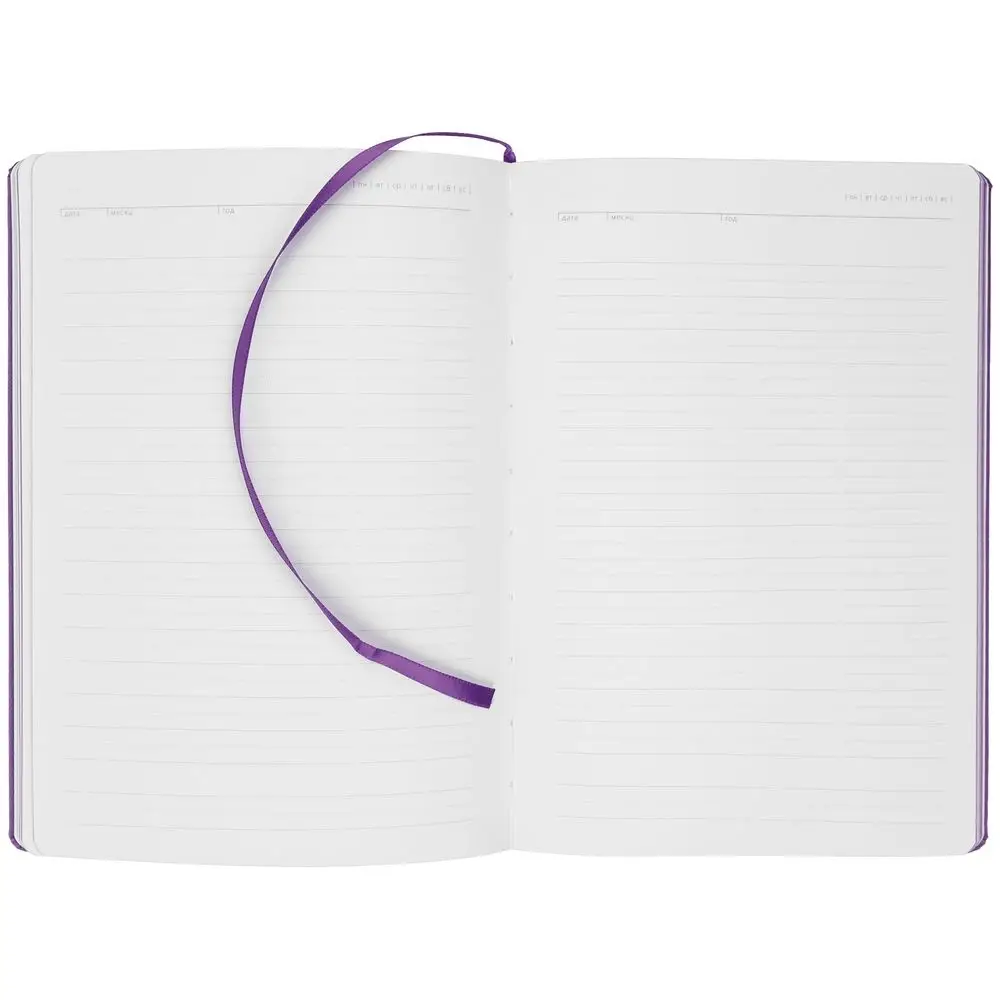 Ежедневник с твердой обложкой и тонированным обрезом. Выполнен из материала Latte, фиолетовый, дополнен ляссе в цвет обложки.