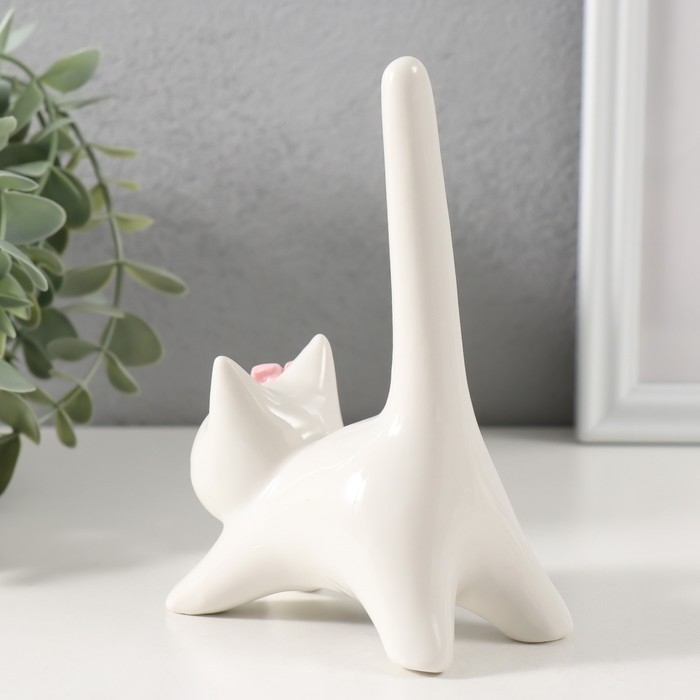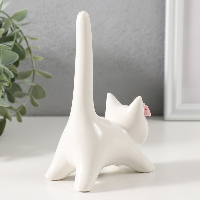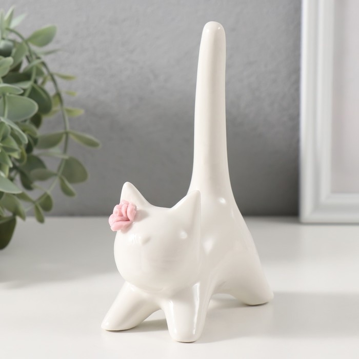 Сувенир керамика "Котик белый с длинным хвостом и розовым цветком" 9,4х5,3х14 см