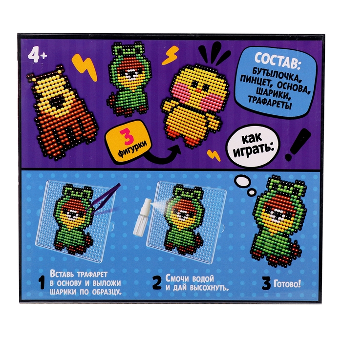 С аквамозаикой «Зверята» ребёнок соберёт 3 объёмные фигурки из шариков-пикселей. Детали плотно скрепляются друг с другом. С поделками можно играть или украсить интерьер.