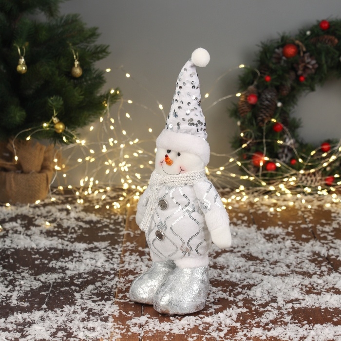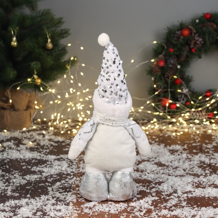 Мягкая игрушка "Снеговик в блестящем колпаке" 38х19 см, серебристо-белый