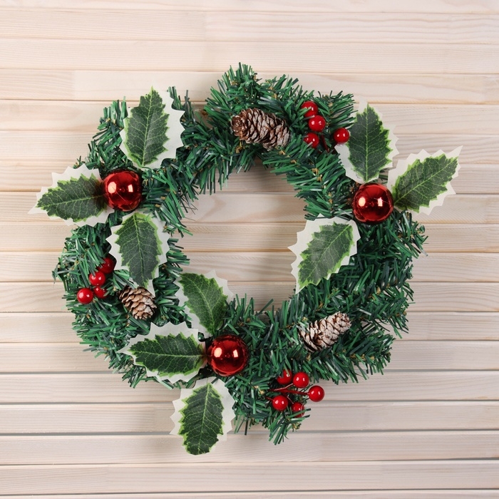 Венок новогодний d-30 см "Лесной фестиваль" листья шары