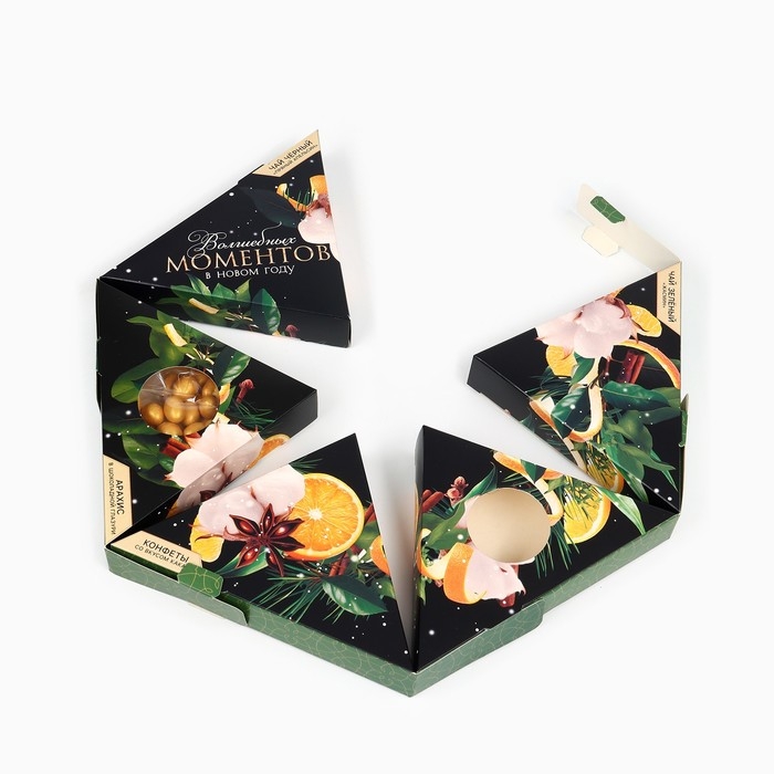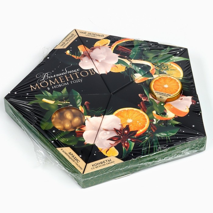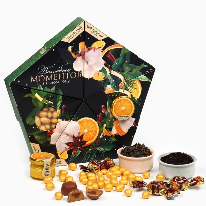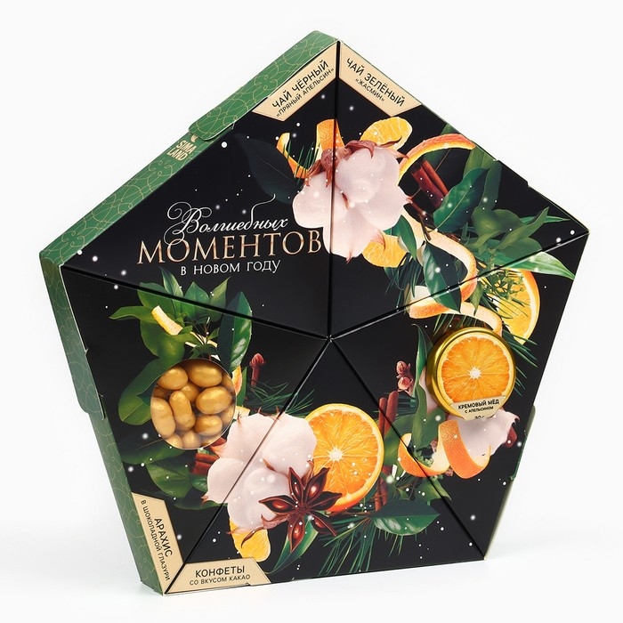 Новый год! Подарочный набор «Волшебных моментов в новом году»: чай зеленый с жасмином и чёрный: пряный апельсин 20 г., арахис в глазури 70 г., конфеты с начинкой 100 г., крем - мёд со вкусом апельсина 30 г.