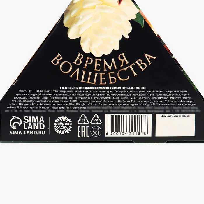 Состав: шоколадная глазурь белая (сахар, какао-масло, сухие молочные продукты, эквивалент какао-масла, эмульгатор – лецитин, ароматизатор «Ванилин»), ядро арахиса жареного отбелённого, глянец – комплексная пищевая добавка «Капол».