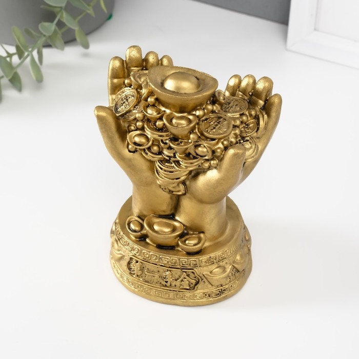 Нэцкэ полистоун под бронзу "Монеты и слитки в ладонях" 7,7х10,7х14 см