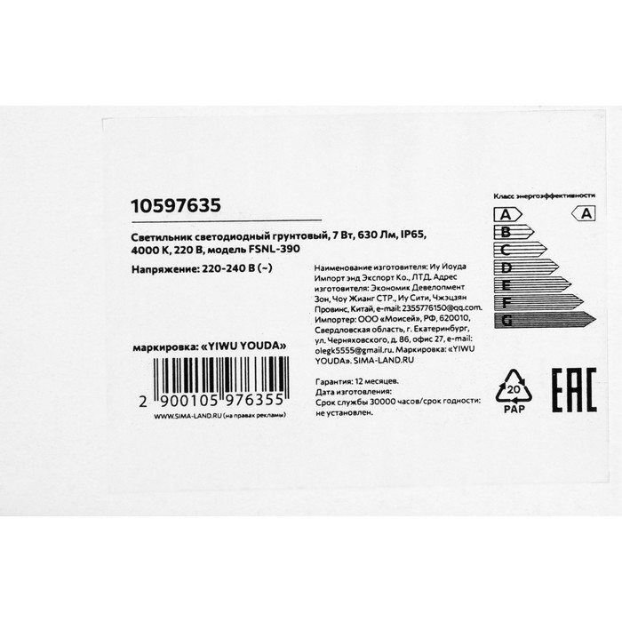 Светильник светодиодный грунтовый, 7 Вт, 630 Лм, IP65, 4000 К, 220 В