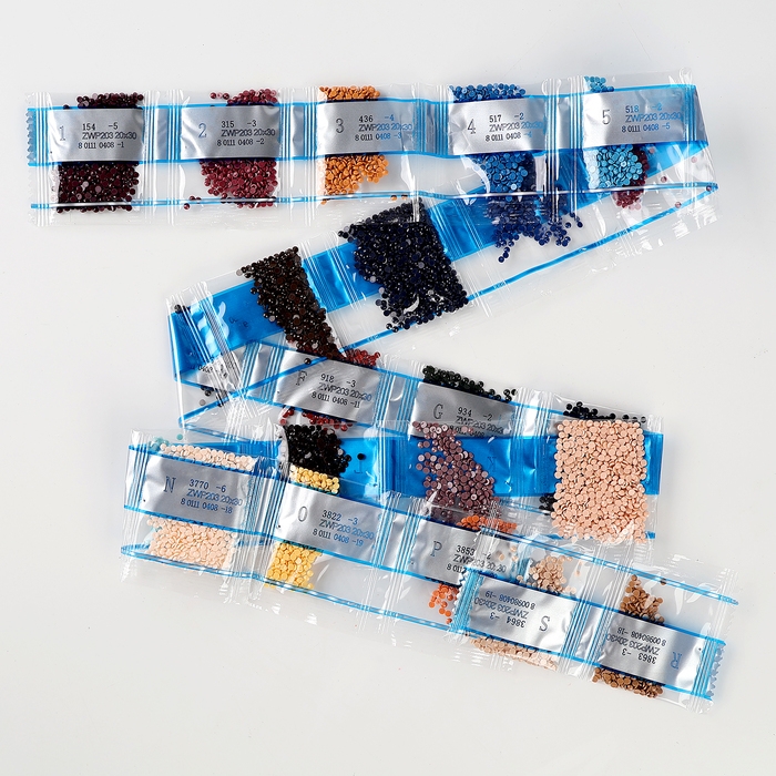 - Из пакетика с номером, который соответствует схеме, отсыпьте в ёмкость немного страз.