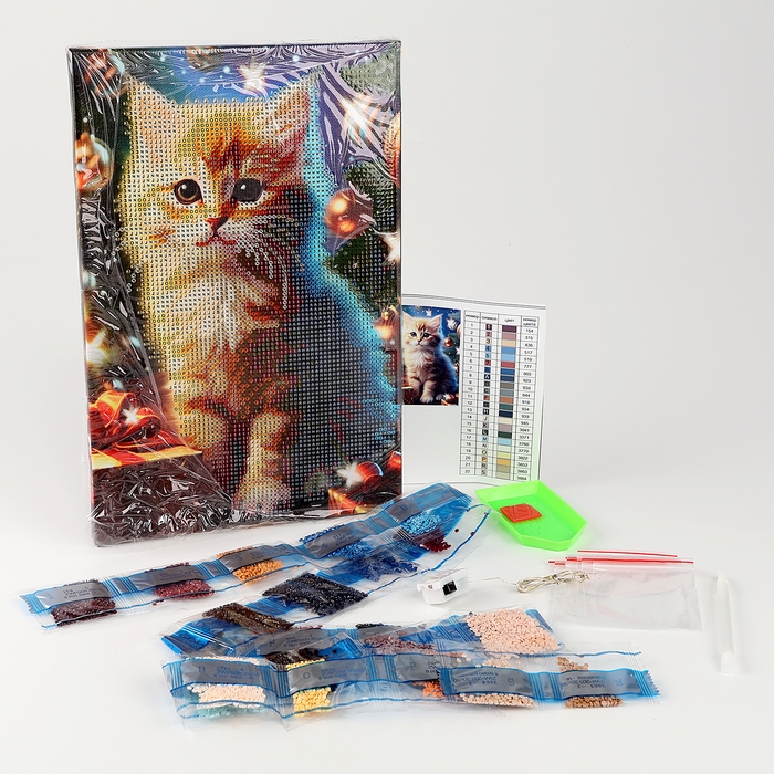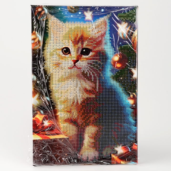 Алмазная мозаика на новый год с частичным заполнением на подрамнике «Котенок», 20 х 30 см, с гирляндой, новогодний набор для творчества
