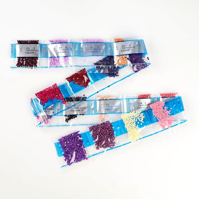 - Из пакетика с номером, который соответствует схеме, отсыпьте в ёмкость немного страз.
