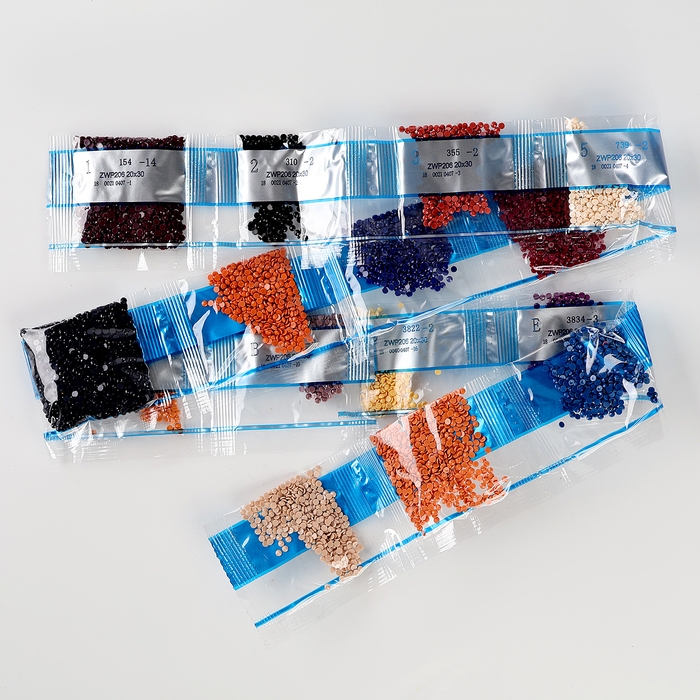 - Из пакетика с номером, который соответствует схеме, отсыпьте в ёмкость немного страз.