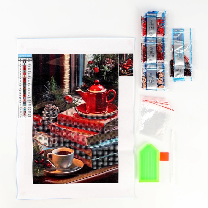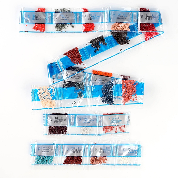 - Из пакетика с номером, который соответствует схеме, отсыпьте в ёмкость немного страз.