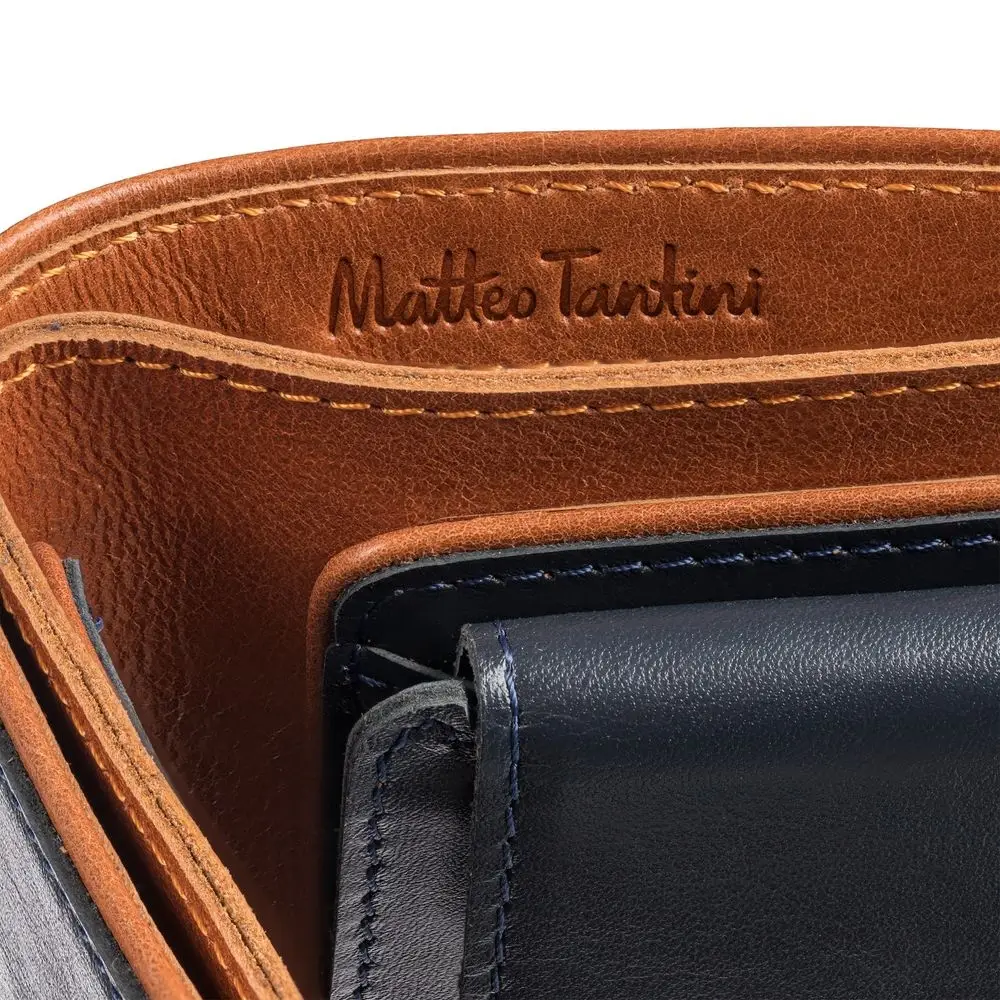 Чтобы передать этот удивительный контраст, для изделий Kalsa Palermo была выбрана гладкая натуральная кожа: глубокого синего цвета снаружи и светло-коричневого оттенка внутри. Оформленные в едином стиле, они легко собираются в подарочные наборы.