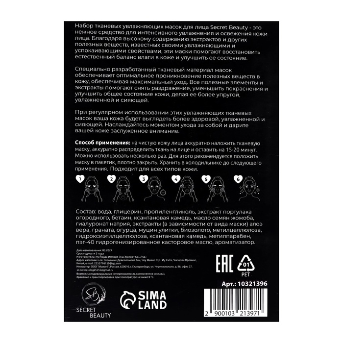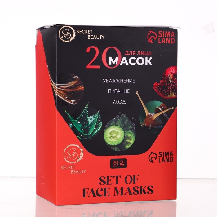 Набор увлажняющих, тканевых масок для лица «SB Beauty», 20 шт