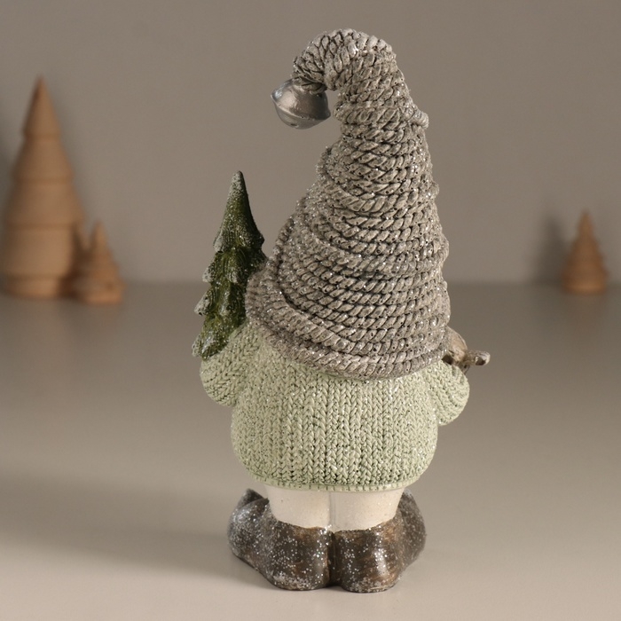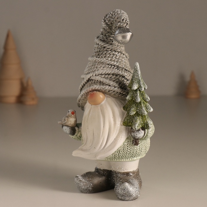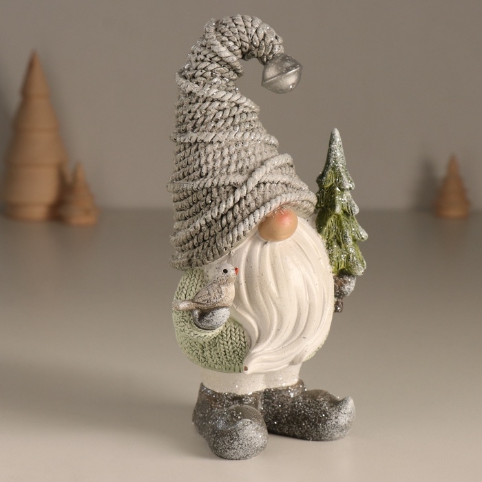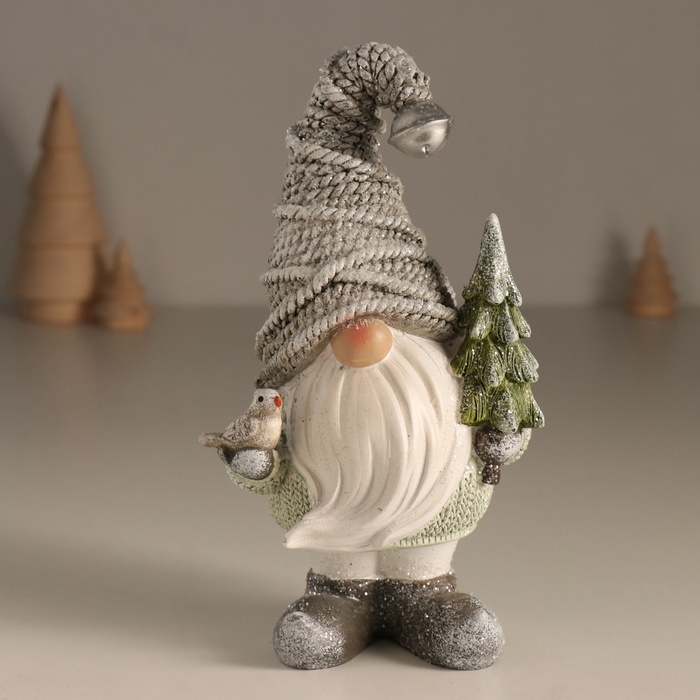 Сувенир полистоун "Дед Мороз в колпаке с бубенчиком, с ёлкой и птицей" серый 10х7,2х17,5 см 103259